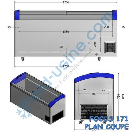 FOCUS - une gamme de 5 conservateurs à glaces ludiques, avec son encadrement bicolore gris / rouge. Couvercles vitrés coulissants sur plan incliné (plan exposition produits: droit) et vitres sans cadre pour une meilleure visibilité des produits. Meuble sur roulettes pivotantes. Economique en utilisation et moins de givre grâce à l'isolation renforcée (75mm). Encadrement réchauffé pour éviter la condensation. Également disponible avec encadrement gris / bleu et tout gris et en version couvercle vitré relevable FOCUS-V (gris). Paniers disponibles en option: plein air ou scooping